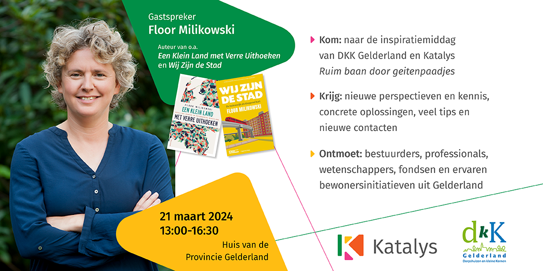 Graag nodigen Katalys en Vereniging Dorpshuizen en Kleine Kernen Gelderland (DKK) uit voor een inspiratiemiddag. Hierin staat de verbinding tussen de systeem- en de leefwereld centraal. Uit het hele land verzamelden ze honderden waardevolle tips en geitenpaadjes en de vraag is nu: hoe maken we het concreet? Wat zouden eerste stappen kunnen zijn? Wie of wat is daarvoor nodig? Doel is om aan het eind van de middag nóg beter in staat te zijn om bewonersinitiatieven de broodnodige ruimte te geven.