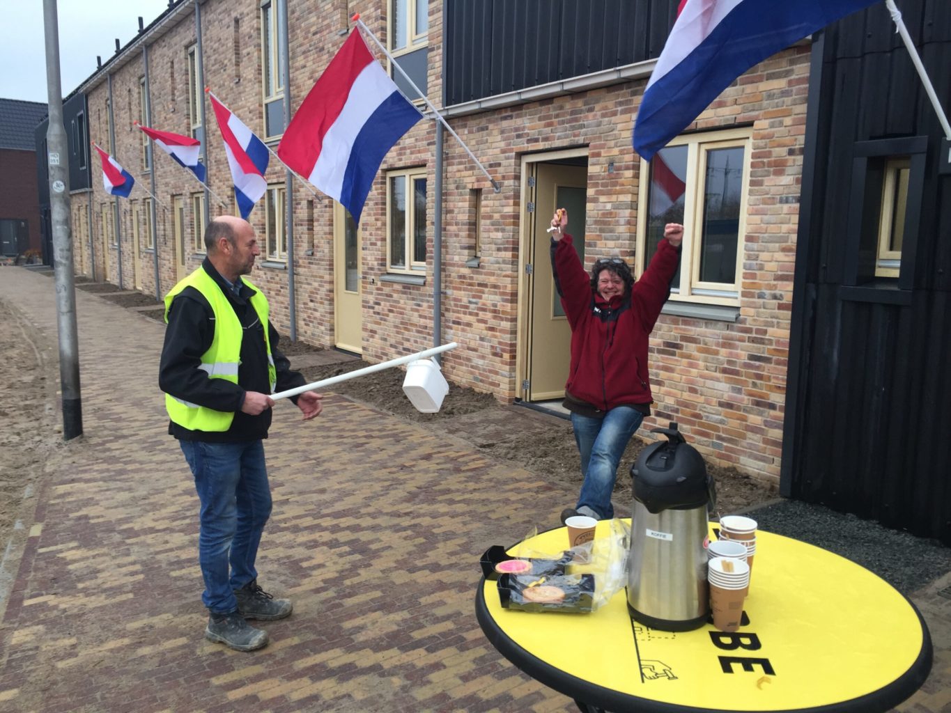 Donderdag 3 december was het zover. De eerste vijf woningen van Ecodorp Zuiderveld zijn opgeleverd. Ecodorp Zuiderveld is een samenwerkingsproject tussen vereniging CVEG, Talis en de WBVG. Op gepaste afstand en met de nodige voorzichtigheid (let je op het bakje?) overhandigde de uitvoerder namens aannemer Trebbe de sleutels aan Marian, een van de kartrekkers van het project. Blij nam ze -na circa 3,5 jaar voorbereiding- de sleutels in ontvangst . Vanaf nu tot ergens in februari zal er wekelijks worden opgeleverd, het totale complex bestaat uit 19 woningen, 21 appartementen en 6 studio’s. De bewoners zullen eerst aan de bak moeten met het aanbrengen van de wandafwerking (leemstuc) en de plaatsing van keukens in de woningen. We zijn net als de WBVG benieuwd hoe de woningen er uiteindelijk uit komen te zien. Veel woonplezier voor de kersverse WBVG-ers!