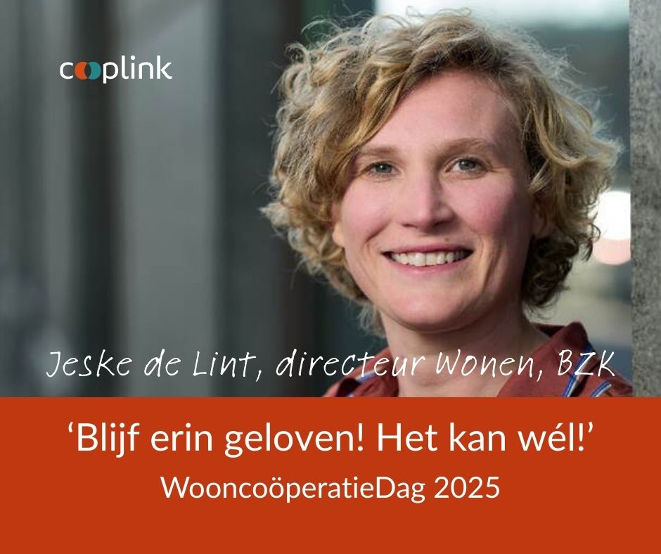 ‘Voorbij de verbeelding’ – het thema van de WooncoöperatieDag 2025 – spreekt Jeske de Lint aan. “Het past bij waar wij als ministerie naartoe werken en ook bij mijn persoonlijke drijfveer om dit werk te doen. Het is het toekomstbeeld dat iedereen prettig woont, betaalbaar, op een manier die bij hem of haar past. Dat wonen meer is dan alleen een huis. Daarbij komt dan dat mensen samenwonen, elkaar helpen en naar elkaar omkijken. Uit zichzelf, dus los van dat we daar als maatschappij naartoe moeten door personeelstekorten in de zorg.”