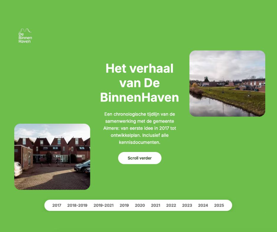 Wooncoöperatie De BinnenHaven deelt haar verhaal zodat andere wooncoöperaties en gemeenten ervan kunnen leren. Een overzichtelijke tijdlijn laat de mijlpalen zien in de samenwerking met de gemeente Almere. Plus alle documenten die zijn ontwikkeld, van eerste idee (2017) tot ontwikkelplan (2025), van sociaal bestek tot huishoudelijke reglementen, van financiële analyses tot communicatieplan, van evaluatierapport tot samenwerkingsovereenkomst en veel meer. De tijdlijn biedt een schat aan informatie.